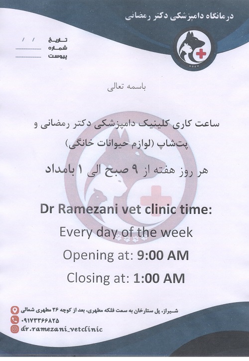 آدرس: فارس - شیراز - پل ستارخان به سمت فلکه مطهری، بعد از کوچه 26 مطهری شمالی، کلینیک دامپزشکی دکتر رمضانی